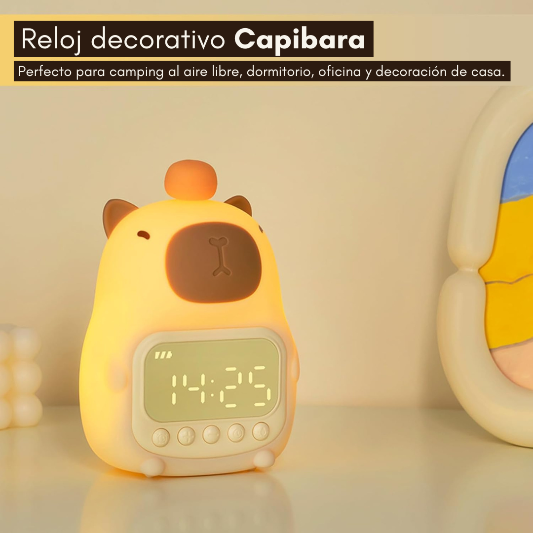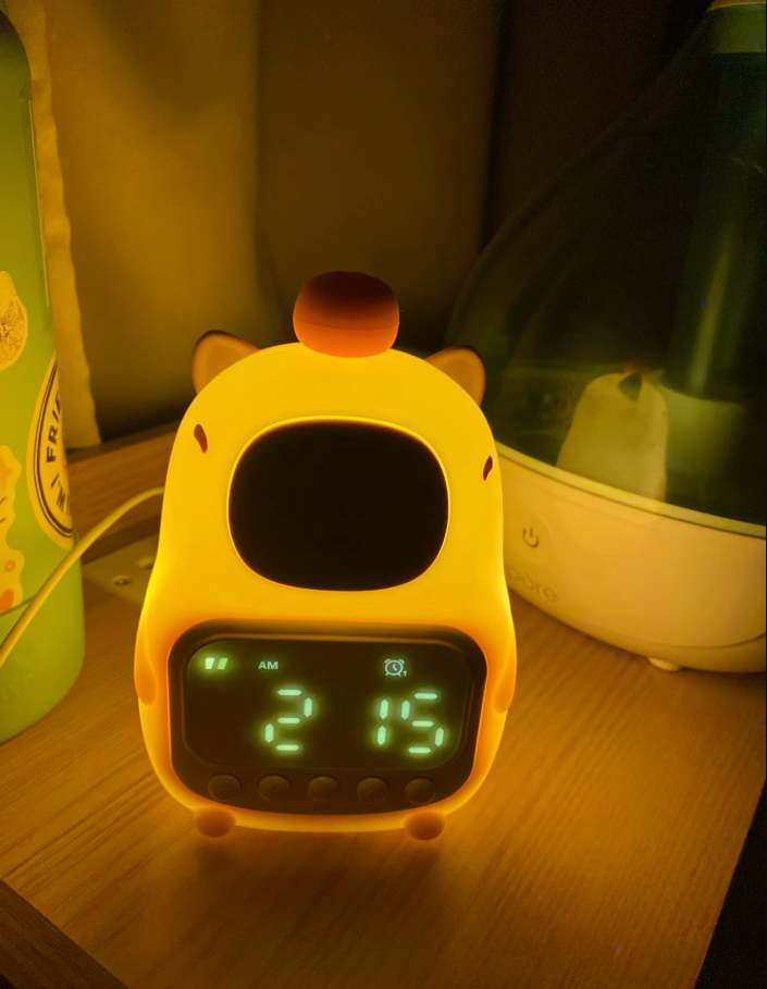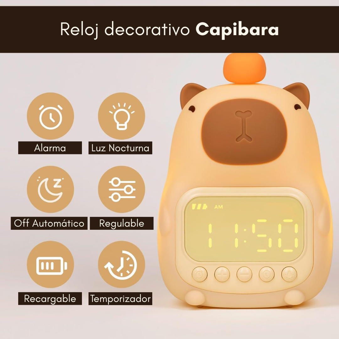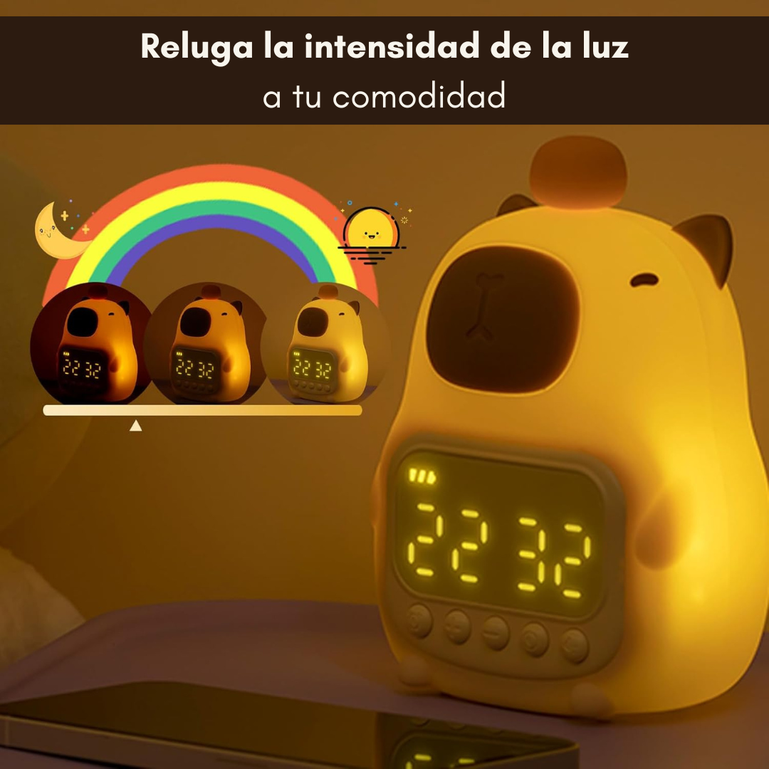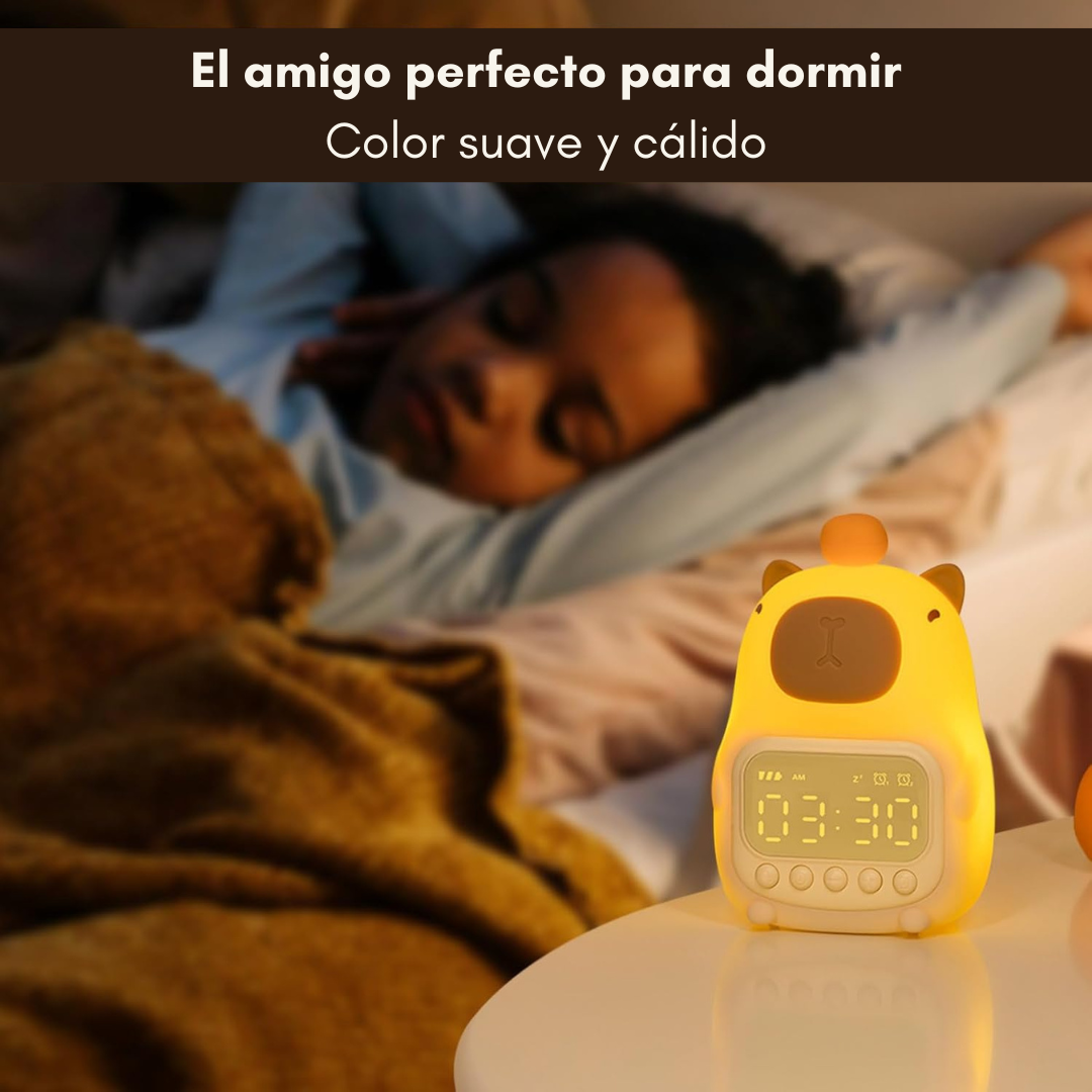 Incluye reloj digital con doble alarma y repetición. Se apaga sola después de 30 minutos, ideal para dormir sin preocuparse. También sirve como luz guía suave para levantarse en la noche sin encandilar.