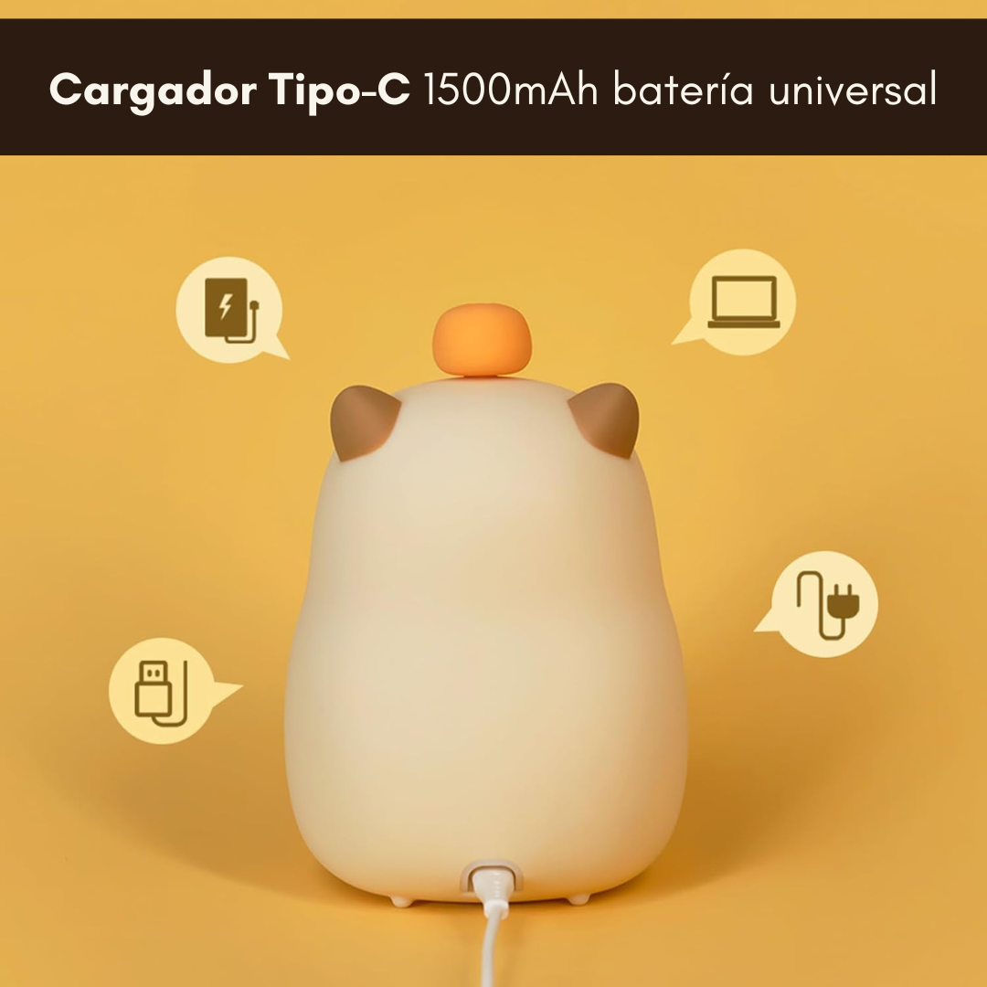 Una adorable capibara con mandarina, ideal para niños o adultos con espíritu joven. Su luz cálida y suave crea un ambiente acogedor. Fabricada con silicona blanda y ABS, es segura incluso para bebés.